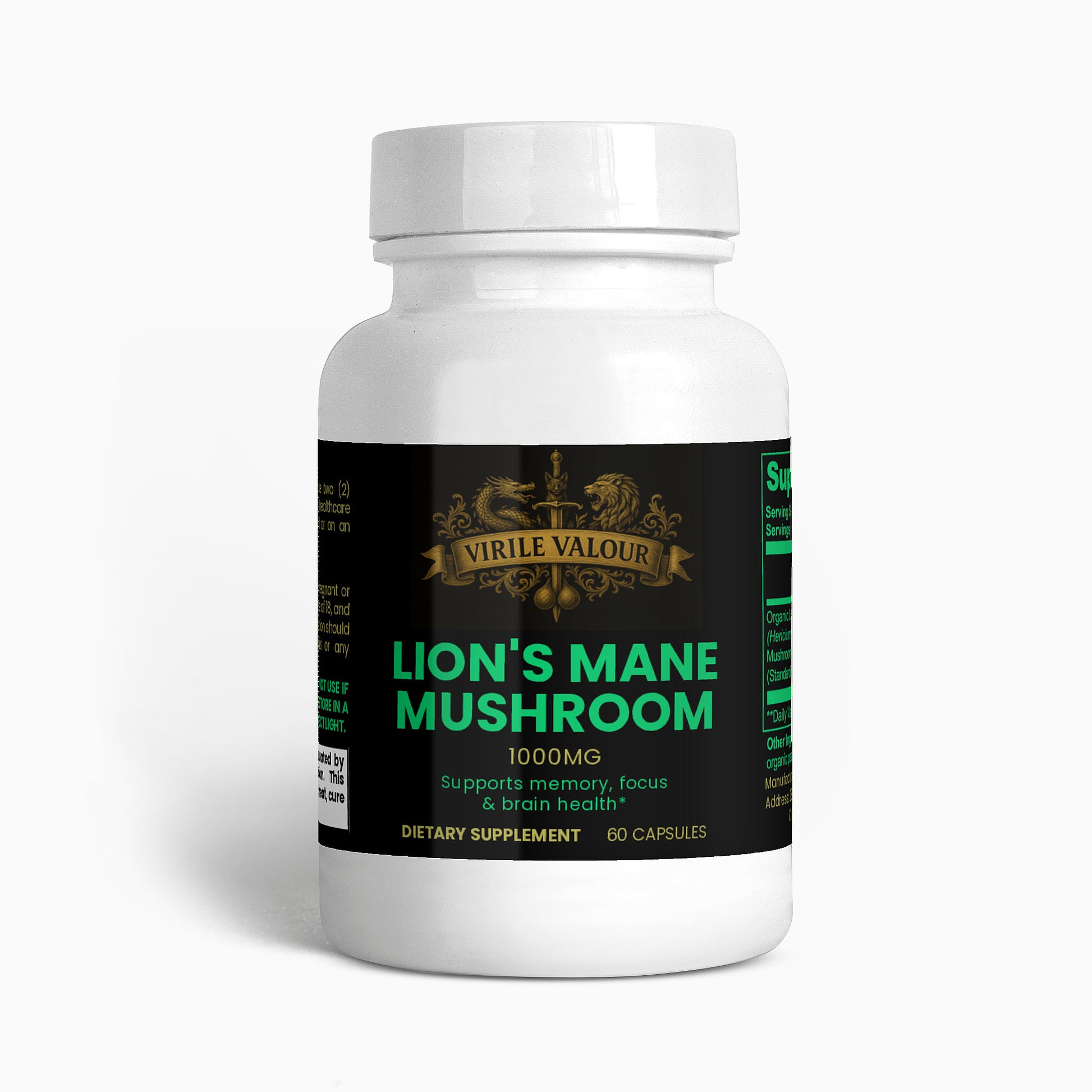 Ingredients: Organic Lion’s Mane (Hericum erinaceus) Mushroom Fruiting Body & Mycelium Powder (Standardized to 40% polysaccharides [400mg]), Organic capsule (pullulan, water), organic pea starch.