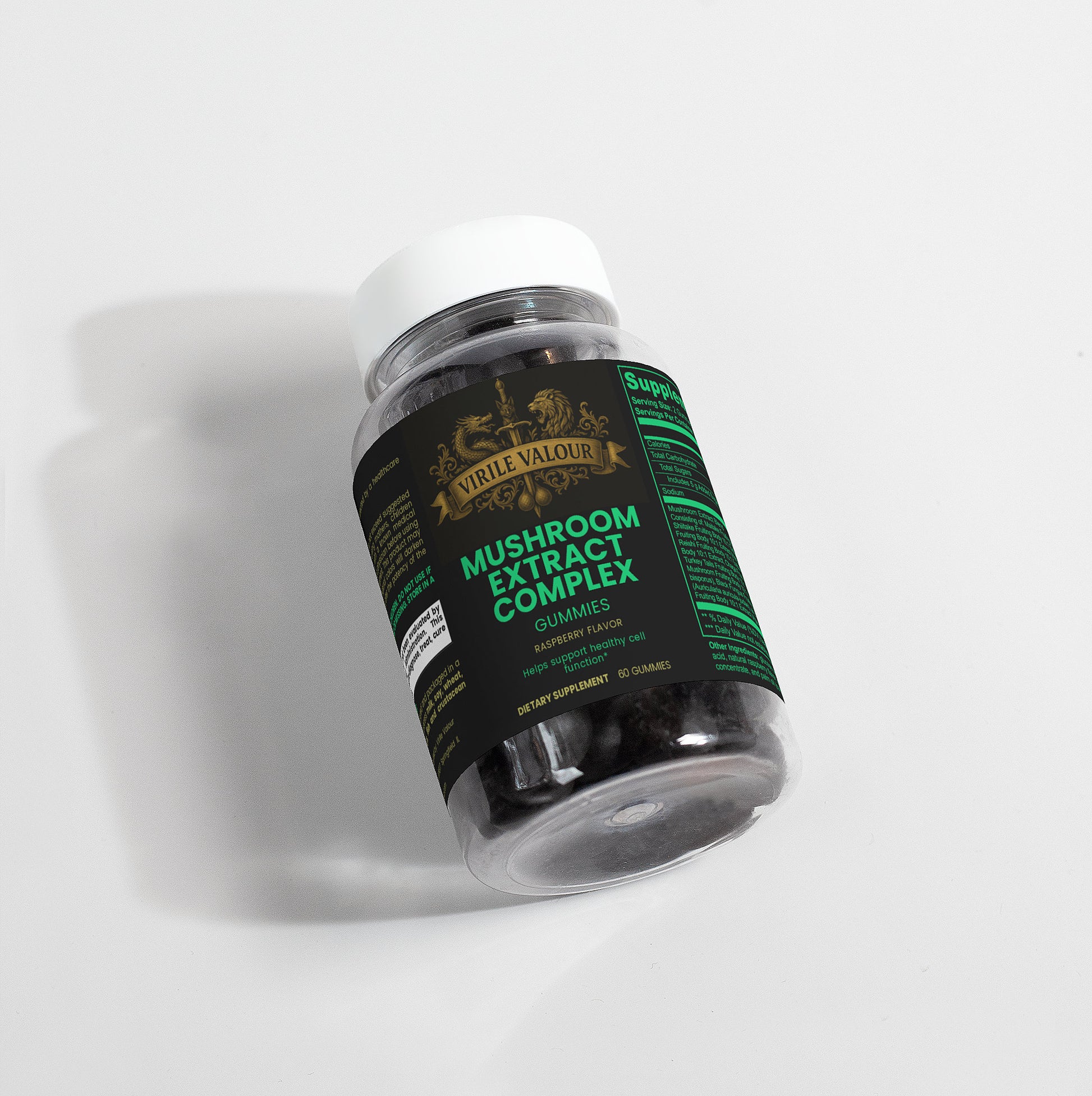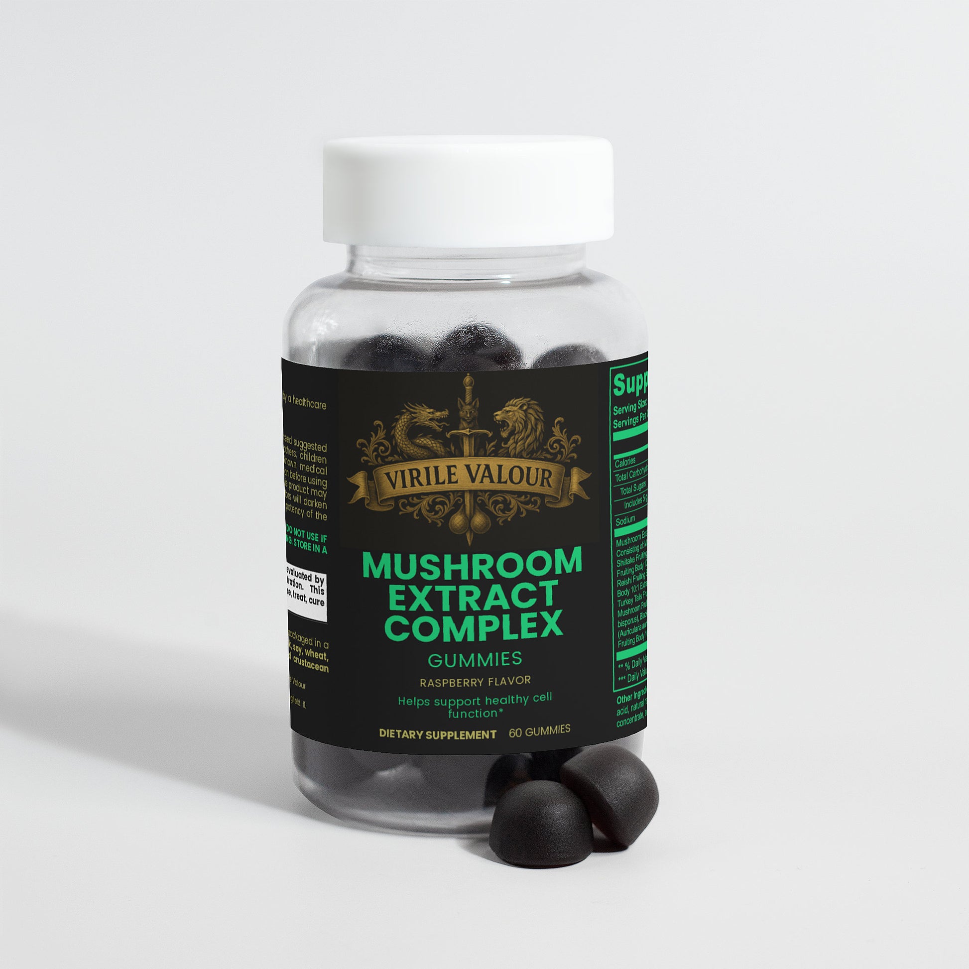 Ingredients: Mushroom extract (Maitake Fruiting Body 10:1 Extract, Shiitake Fruiting Body 10: 1 Extract, Lion’s Mane Fruiting Body 10:1 Extract, Reishi Fruiting Body 10:1 Extract, Cordyceps Fruiting Body 10:1 Extract, Chaga Fruiting Body 10:1 Extract, Turkey Tails Fruiting Body 10:1 Extract, White Button Mushroom Fruiting Body 10:1 Extract, Black Fungus Fruiting Body 10:1 Extract, Royal Sun Mushroom Fruiting Body 10:1 Extract), glucose syrup, sugar, dextrose, pectin, citric acid, natural raspberry flavor, sodium citrate, purple carrot juice concentrate, palm oil (contains carnauba wax).